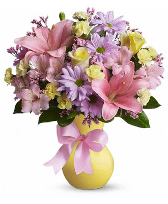 Are you searching for a gift to commemorate your coworker's job anniversary or to express your appreciation to your closest companion? Look no further than Teleflora's Simply Sweet bouquet. This one-of-a-kind arrangement of fresh and stunning flowers in a yellow glass vase is a treat for the senses. Its invigorating appearance and delightful fragrance can enliven any space with warmth and affection. The bouquet highlights symbolic flowers like vibrant yellow roses, which symbolize happiness and delight, and pink limonium, light yellow miniature carnations, and pink asiatic upward facing lilies with soft petals, which represent royalty and devotion. It also includes alstroemeria, which conveys love and affection, and lavender daisy spray chrysanthemums, which signify optimism and joy. Teleflora's Simply Sweet bouquet is the ideal present for both friends and coworkers. You can make it even more special by adding a personalized note or sharing your fondest memories with your friend. Additionally, you can opt to schedule your bouquet in advance for a fresh delivery on a later date or take advantage of our same-day delivery service. Our local florists in Canada and the U.S. hand-select fresh flowers for each bouquet, guaranteeing that every order is delivered with the utmost freshness and care. Don't wait any longer to spread joy and happiness - place your order now!